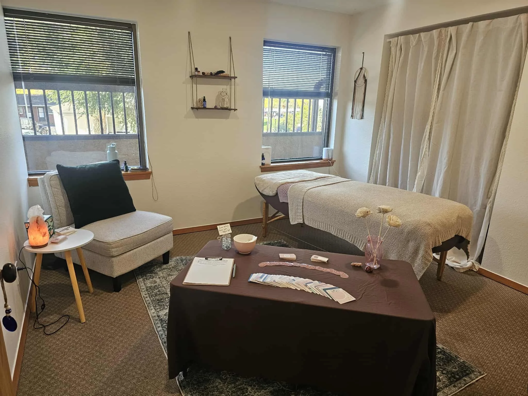 The Heartspace Room is a cozy, restorative sanctuary designed for deep healing and soulful connection. Equipped with a comfortable massage table, salt rock lamp, essential oil diffuser, bluetooth speaker, and cleansing tools (including smoke-free options like Palo Santo or sage), this space invites calm, clarity, and renewal.